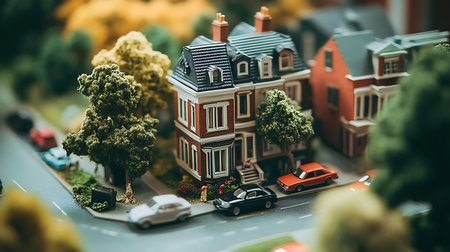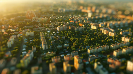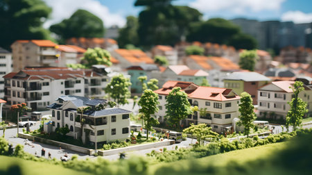 An overhead perspective reveals a residential neighborhood, showcasing houses interspersed with trees. The composition utilizes a shallow depth of field, with soft focus on the foreground and background. The scene is illuminated with natural sunlight, suggesting a pleasant day. This image can be used for real estate, urban planning, or illustrating residential concepts.