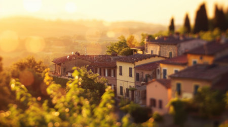 Defocused background of a quaint tuscan village bathed in the ethereal glow of the sunrise.