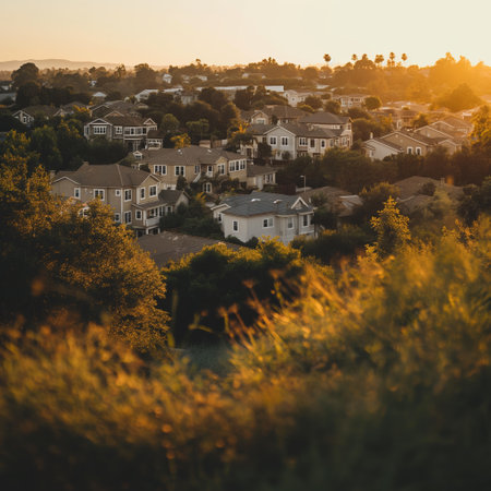 Suburban Homes at Sunset with Lush Greenery and Scenic Landscape.