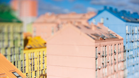 Vibrant tilt-shift image showcasing the colorful modern residential architecture of Comfort Town in Kyiv, creating a playful miniature world effect.
