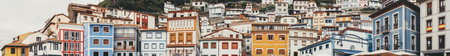 Panorama of colorful facades of traditional houses in Cudillero, Spain, tightly stacked on the hillside, creating a picturesque coastal village scene full of charm, culture and Mediterranean character
