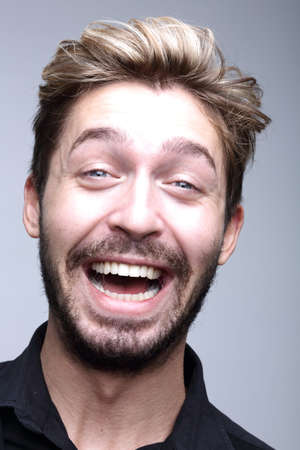 Close up portrait of young smiling handsome guy in black t-shirt isolated on black