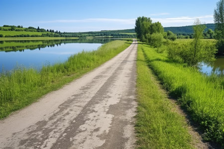 flat dirt path for cycling alongside a calm lake, created with generative ai