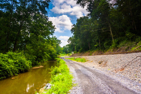 Creek and railroad track along a dirt road in Baltimore County, Maryland.