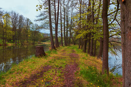 Spring landscape with green trees. The trees are reflected in the pond water.