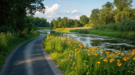 A picturesque trail lined with blooming wildflowers runs alongside a tranquil river, creating a serene scene under the warm sun. The lush greenery invites exploration into natures beauty.