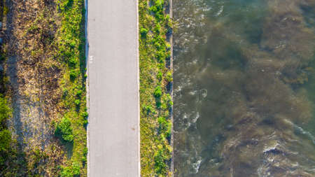 Top down aerial view of riverside meadow on the river bank and the movement of the water taken by a drone. High quality photo