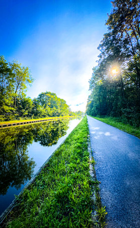 The Kembs canal, in Alsace, France, and its parallel bike path leading to Saint Louis