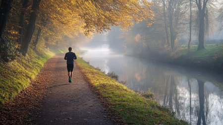 A morning jogger running along a misty river track, representing fitness, health, and serenity in nature.