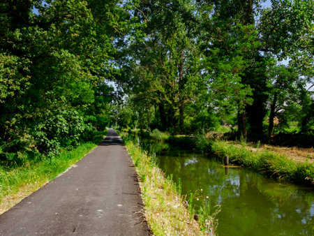 Naviglio of Bereguardo, a long canal from Abbiategrasso (Milan) to Bereguardo (Pavia, Lombardy, Italy)., with lane for bicycles and pedestrians. Rural landscape at summer