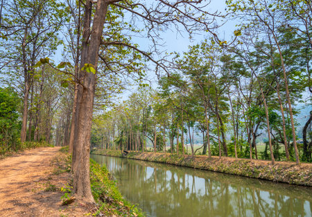 This mesmerizing aerial perspective offers a top-down view of a peaceful canal winding its way through a lush, green landscape. Towering trees line the waters edge, creating a picturesque scene of natural serenity. The tranquil flow of the canal reflects the surrounding greenery, inviting viewers to immerse themselves in the soothing beauty of this idyllic location. Tranquil Aerial View of Serene Canal Amidst Lush Greenery. High quality photo