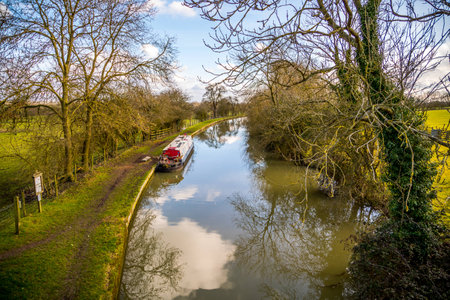 A canal tow path in Surrey, UK. Two narrow boats and nice reflections in the water.