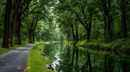 A peaceful scene showcasing a bicycle resting alongside a serene canal path, surrounded by lush green trees and bright sunlight for a perfect outdoor escape.