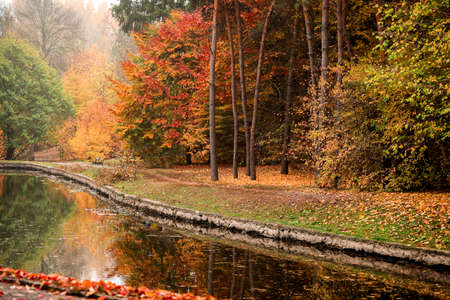 Autumn landscape with a path on the river. Colorful trees in autumn.