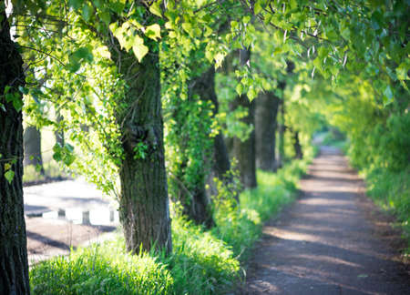 Beautiful sunrise landscape of sunlight glowing on footpath in trees