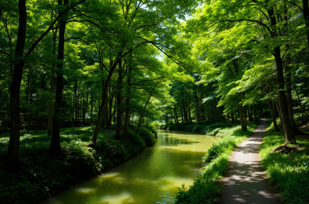 A stunningly beautiful river pathway that beautifully reflects the serene beauty of nature under a bright sky
