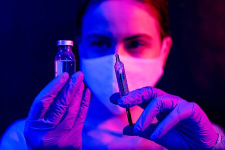 Concept fight against virus covid-19 corona virus. Female holding a syringe with liquid vaccines