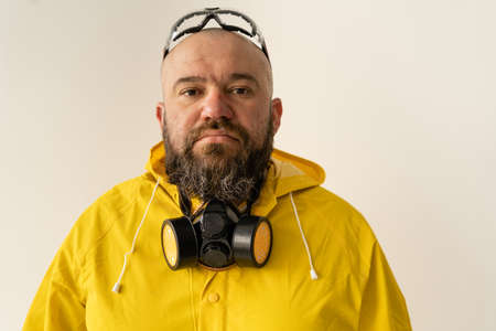 male portrait, lab worker wearing a yellow protective suit, mask and respirator removed. Virus and Disease Protection Concept