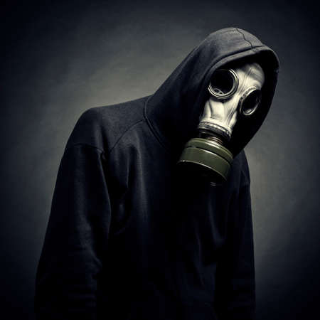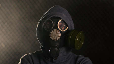 Environmental disaster. Post-apocalyptic survivor in gas mask on a dark background. Dramatic portrait of a man wearing a gas mask. Means for radiation protection. Selective focus
