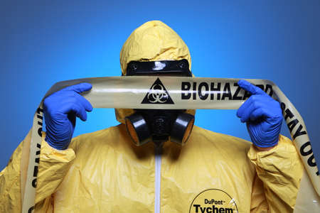 Biological Hazard Worker Safety. Men Wearing Full Face Cover Chemical Mask and Hazmat Suit. Biohazard Symbols Around His Mask.