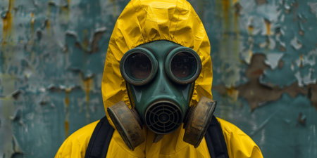 Cinematic portrait of individual in yellow hazmat suit and black gas mask with isolated background