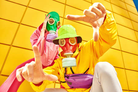 Stop environmental pollution. A couple of modern young people in bright clothes and gas masks look at the camera and stretch out their hands to it. Modern art.