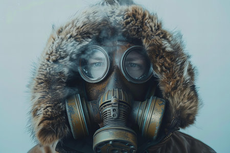 Environmental activist wearing gas mask is protesting against air pollution from industrial factory chimneys emitting toxic smoke, fighting for clean air and environmental protection