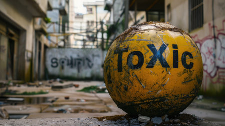 Toxic waste barrel with biohazard sign and leaking green substance.