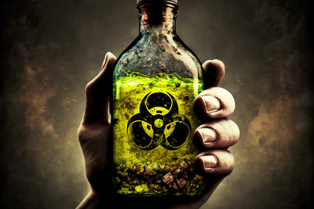 container with a poisonous substance in the scientist's hand, a yellow warning label with a skull and bones, a background of test tubes, a short focus