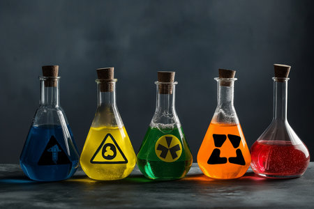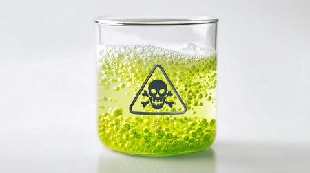 Poison gas symbols hover ominously above a dangerous mixture of chemicals in a laboratory, highlighting the risks of chemical interactions and safety concerns.