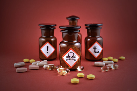 Vial of poison stock images. Vial with warning pictogram stock images. Laboratory accessories. Vials on a red background. Brown glass containers. Brown chemical glass