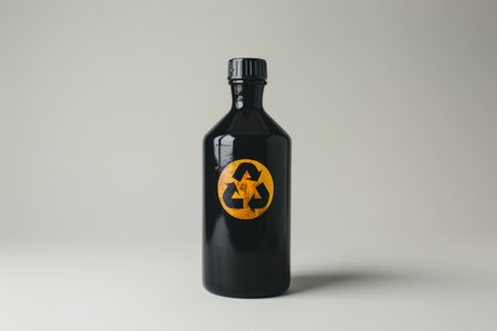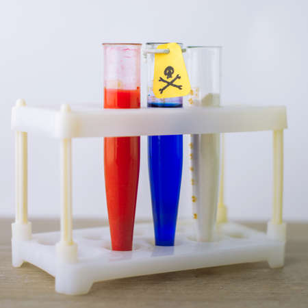 a dark bottle with poison and a yellow warning label, against a background of laboratory test tubes with chemicals