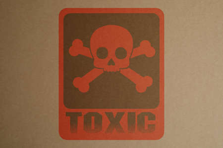 Hazard warning sign (skull-and-crossbones symbol and word TOXIC) on kraft paper, top view