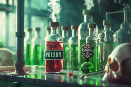In a shadowy apothecary, colorful bottles bubble with potions, while a sinister red vial labeled poison sits prominently, surrounded by a haunting atmosphere and ominous skulls.