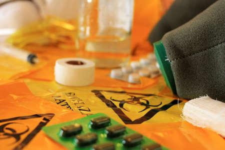 Vial with medical solution or vaccine with empty label for a template, standing on table with sticker warning of threat of biological infection on white wall in blurred background