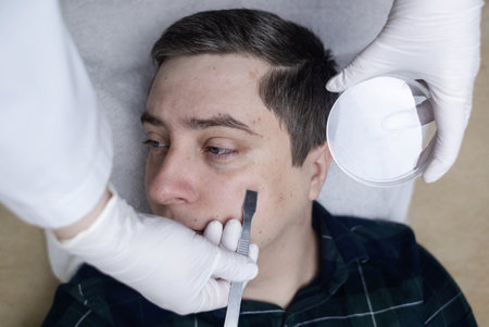 A dermatologist takes a skin scraping and tests for demodicosis and dermatitis, fungal infection. Close-up of a male patient's face at a doctor's appointment