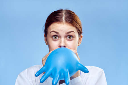 Young beautiful woman against blue background puffing up a glove in a medical dressing gown, portrait.