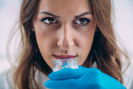 Medical sample in lab tube in the scientist hands in blue medical gloves on light background.