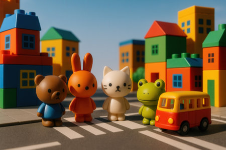 Explore vibrant toys lined up by a window showcasing a playful city backdrop.
