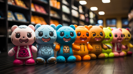 A vibrant collection of cuddly characters, playfully arranged on a shelf in an indoor toy store, exuding a whimsical and cartoon-like charm