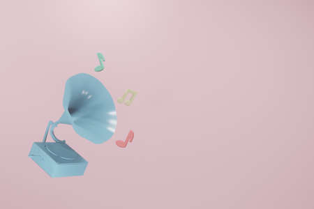 Blue vintage vinyl player with music notes on pink background. 3D rendering image.