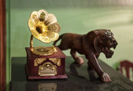 The Decorative statuette of gramophone on white background. Close up photo