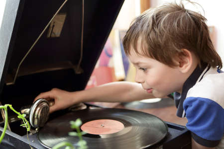 Child playing with gramophone in a museum
