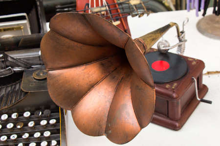 A closeup shot of an old vintage gramophone and a typing machine