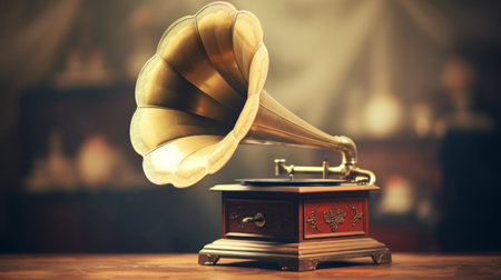 Classic Edison Phonograph on a wooden table in a dark studio. Retro vintage machine to reproduce sound making listening to music. Antique musical instrument with loudspeaker trumpet and rotary handle.