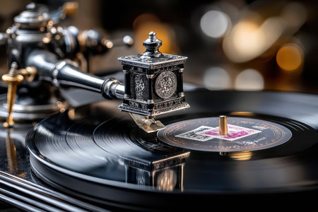 A vintage record player showcases intricate metal details while spinning a black vinyl disc in soft lighting.