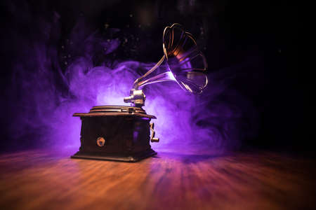 Music concept. Old gramophone on a dark background. Retro gramophone with disc on wooden table with toned backlight. Selective focus