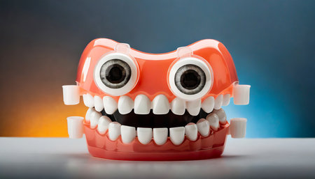 Funny plastic model of mouth with blue eyes and white teeth.