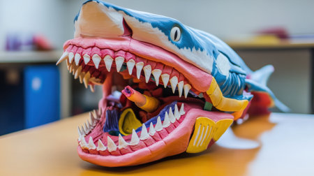 This photo showcases a vibrant and artistic representation of a shark, featuring a detailed open mouth and mesmerizing colors, perfect for creative projects.
