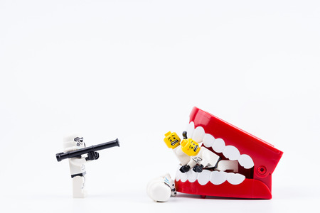 Nonthabure, Thailand - May, 17, 2017 : Lego stormtrooper helping to bring friend out of the red plastic chattering teeth being bitten isolated on white background.